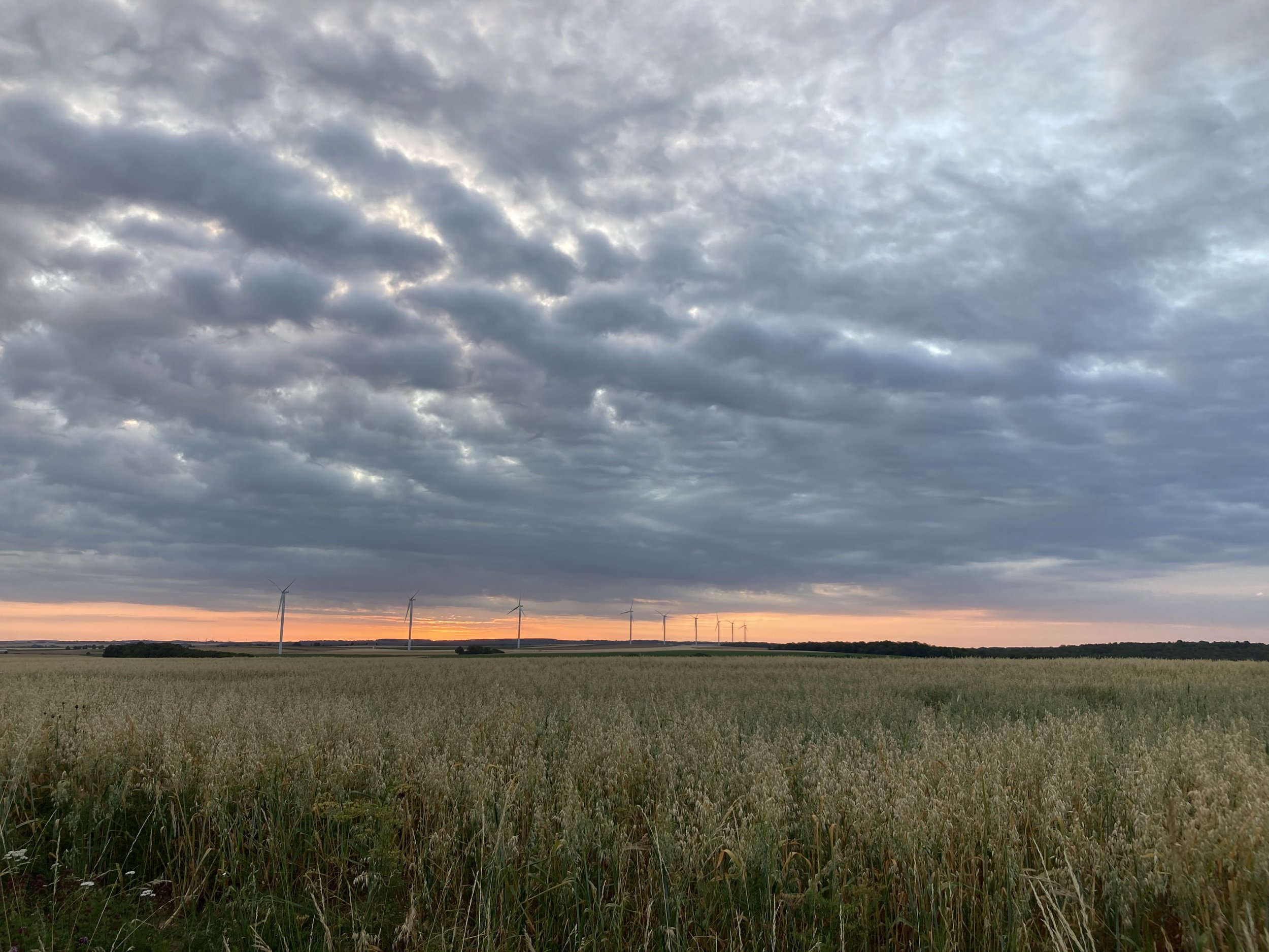 As I emerged from the forest up onto the plateau of fields that surround us I could see the windmills on the skyline, seemingly tying the clouds to the ground, the sun rising with a bright golden glow, that was already starting to warm the day.