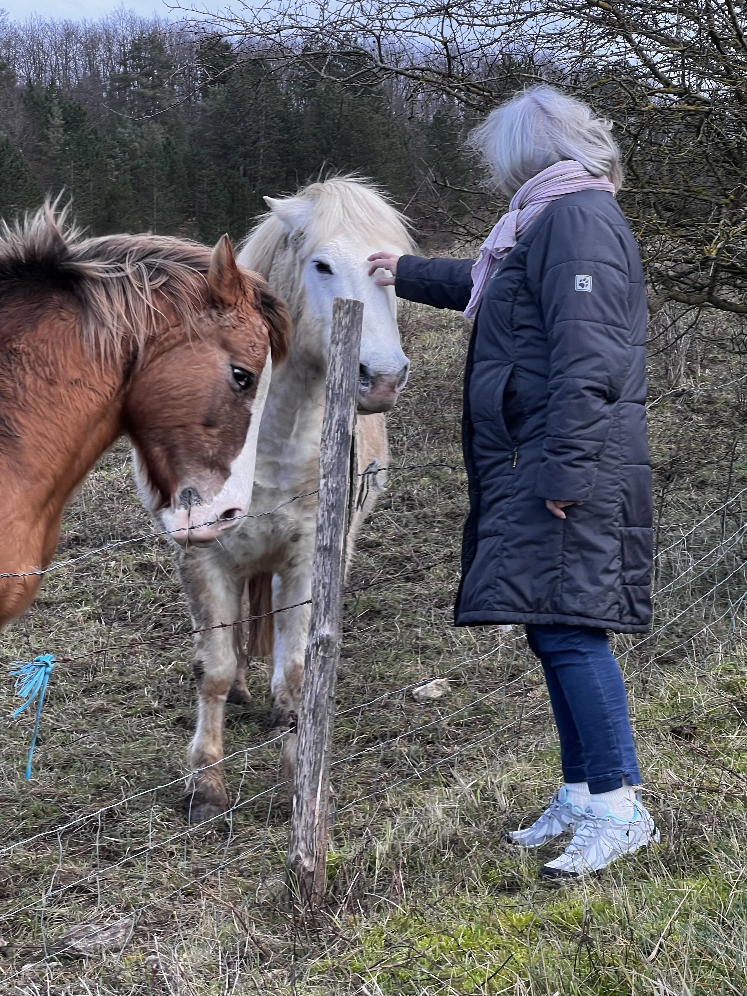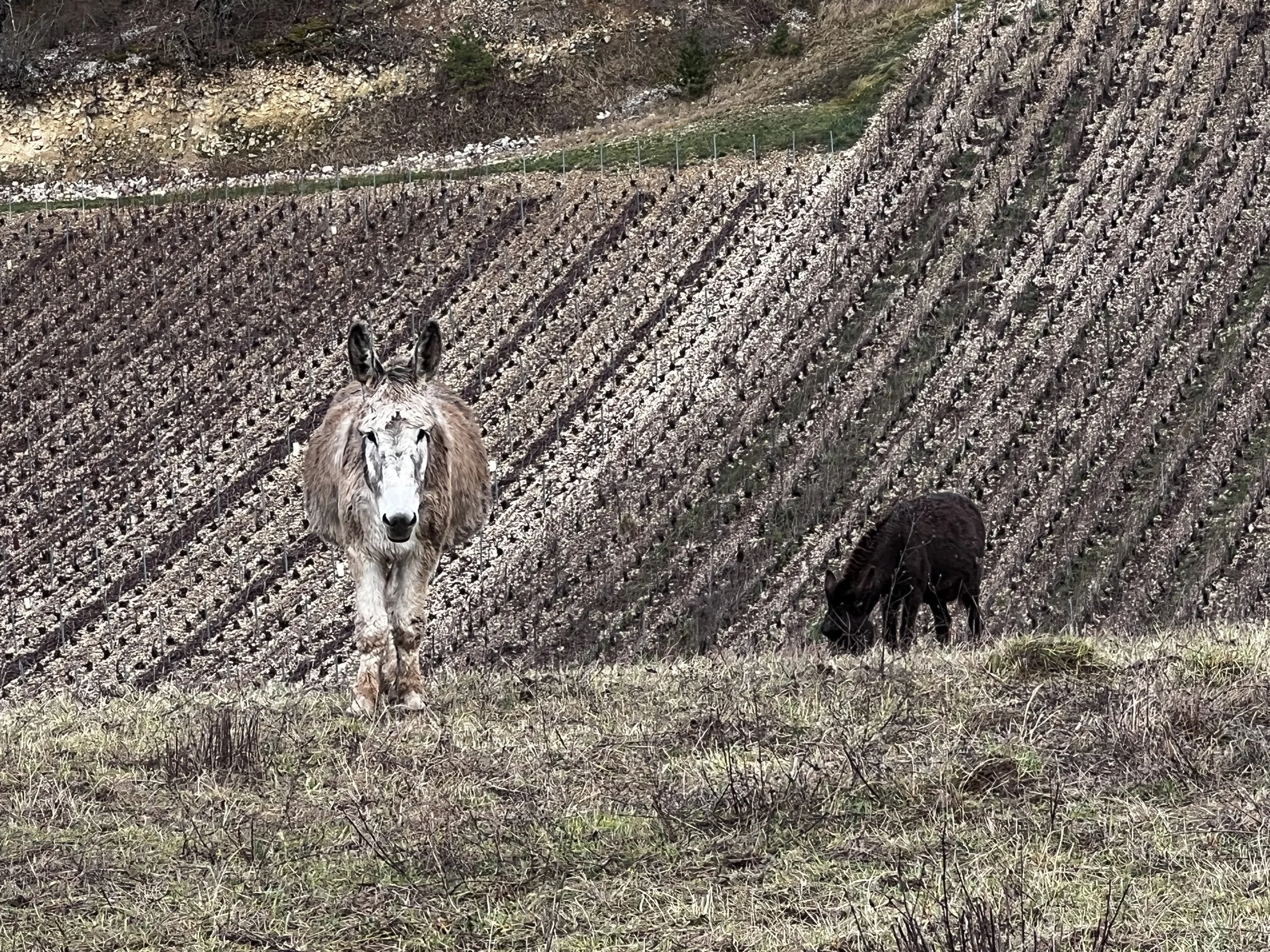 The sun was trying to poke its head out, so we decided we’d take a little New Year’s Eve walk up to the point de vue. It took us past two little donkeys, who enjoy a wonderful field overlooking the vineyards, they share it with a couple of horses, who came to say hello.