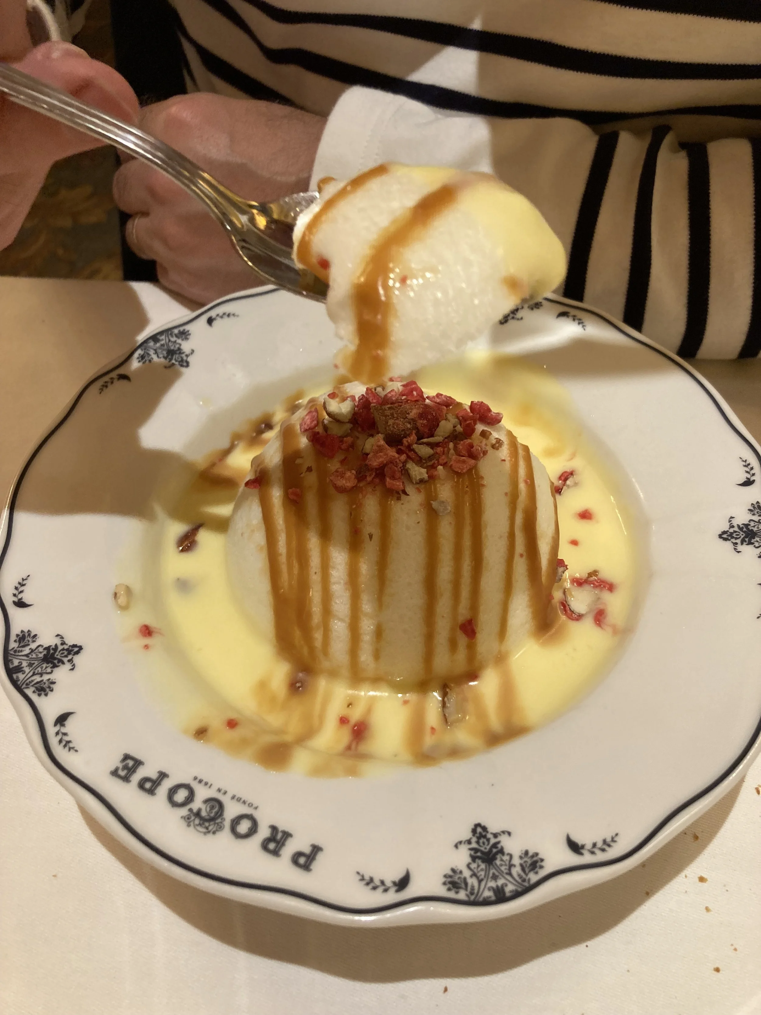 For us it was time for dessert, which we decided to share. ‘small’, very light île flottante, which is a poached meringue on a custard sauce, covered in a salty caramel sauce.